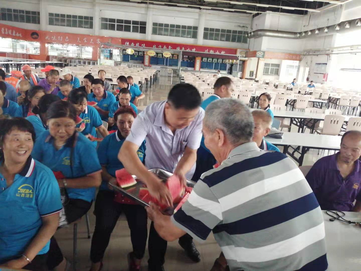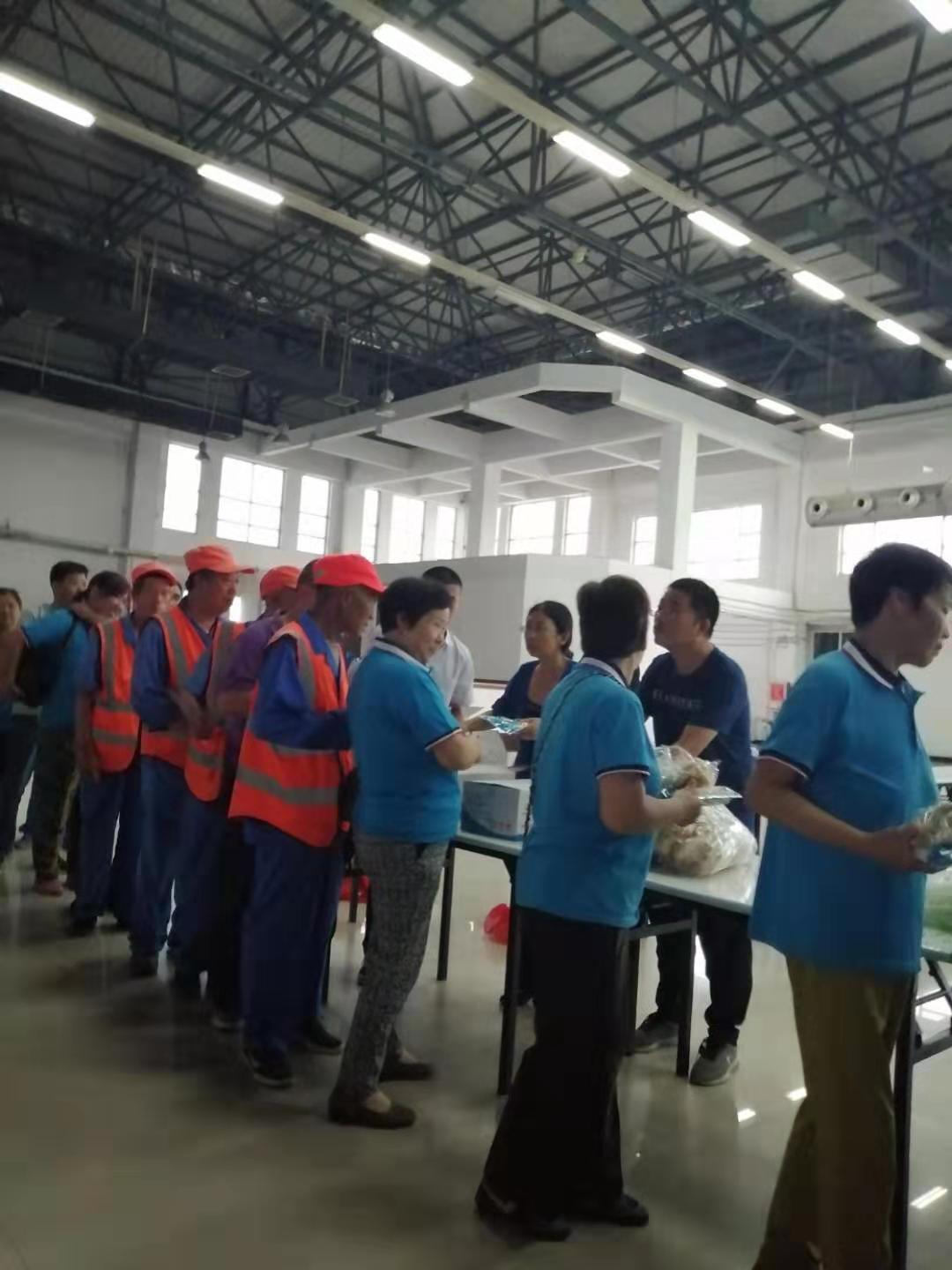 在富士康餐廳二樓,利用工作人員切西瓜的間隙,公司總經(jīng)理程晉軍作了簡(jiǎn)短的講話。他說,前一段時(shí)間,公司召開了“安康杯”勞動(dòng)競(jìng)賽動(dòng)員大會(huì),大家要提高安全意識(shí),始終把安全工作放在心上。他囑托大家在夏季工作中一定要注意防暑,感謝大家在酷暑下依舊兢兢業(yè)業(yè)奮斗在各自的工作崗位上。工會(huì)主席崔偉也作了簡(jiǎn)要發(fā)言,他說,今年是潔霸公司成立二十周年,希望大家在工作中繼續(xù)發(fā)揚(yáng)潔霸精神,積極樹立潔霸形象,為公司爭(zhēng)光。