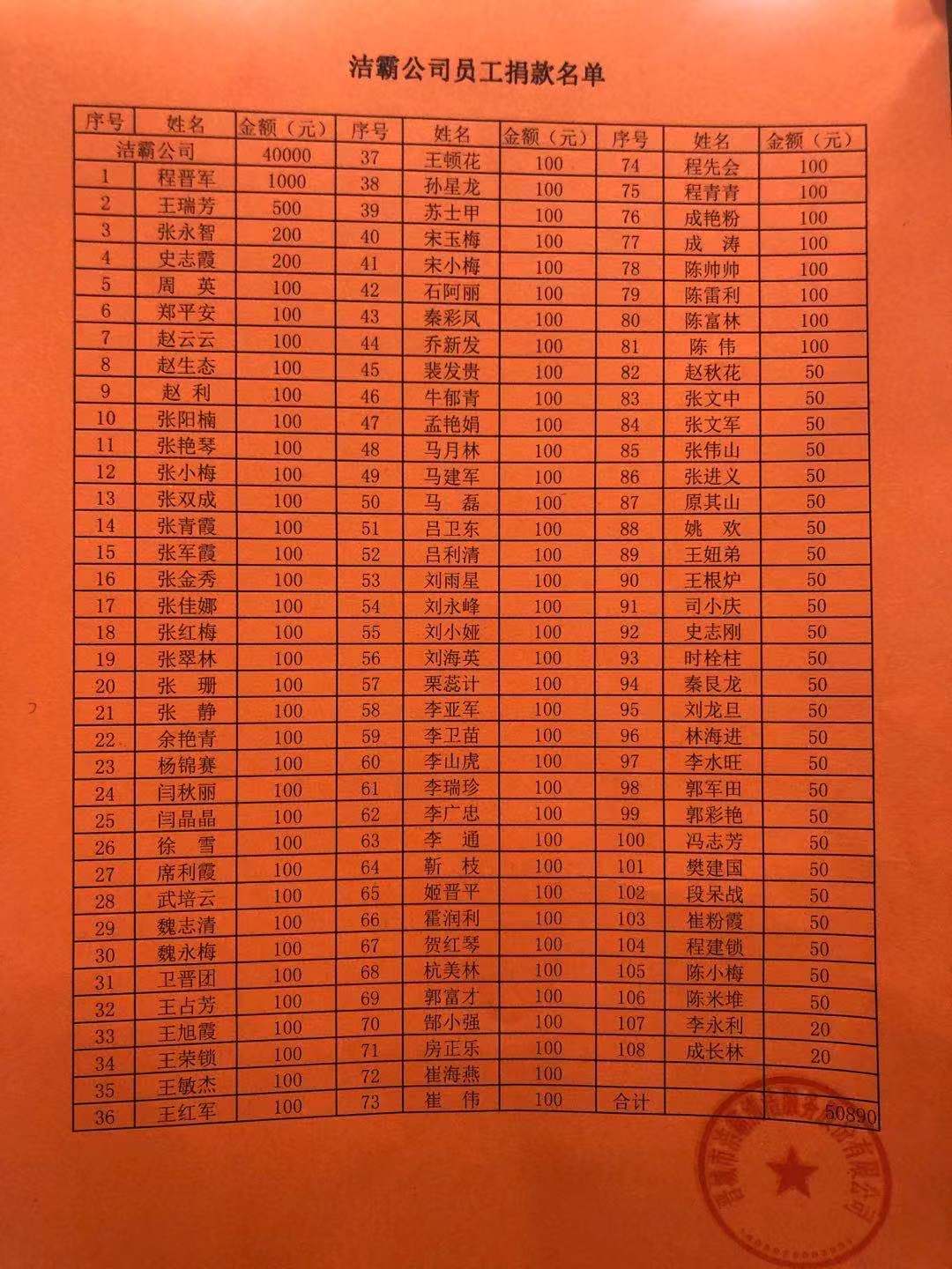 捐款倡議書在“潔霸一家人”群發(fā)布后,大家踴躍參與。公司班子成員率先垂范,帶頭捐款,全體干部員工勠力同心,慷慨解囊,凸顯了潔霸人的責(zé)任與擔(dān)當(dāng)。