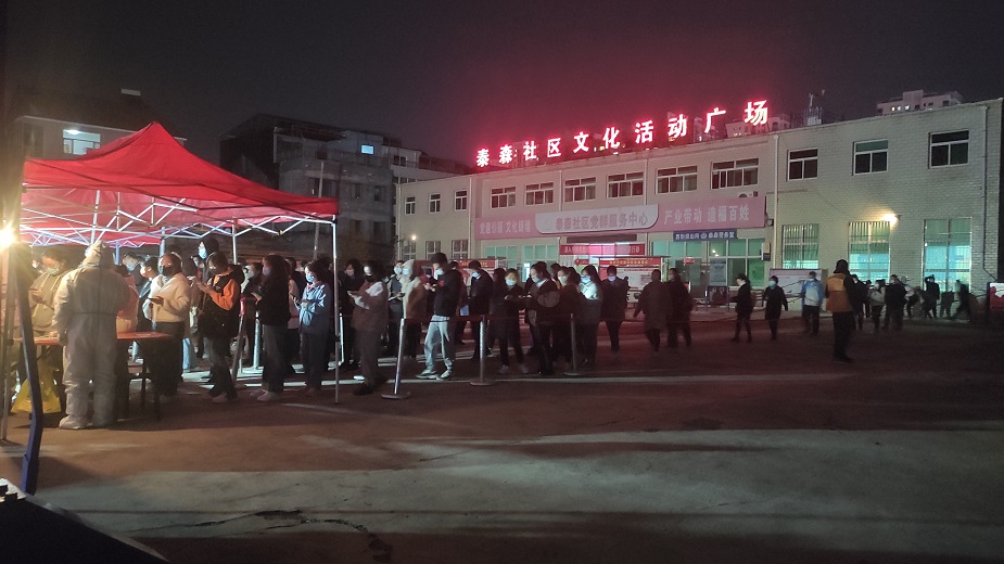 在泰森社區(qū)文化活動廣場,志愿者們擺桌子、拉警戒線、撐帳篷,齊心合力協(xié)助社區(qū)工作人員完成核酸檢測采樣點(diǎn)位設(shè)置及物資配備,同時積極引導(dǎo)社區(qū)居民進(jìn)行掃碼登記、測量體溫,提醒社區(qū)居民全程佩戴口罩,在排隊(duì)期間保持一米間距,組織居民做好分組,提前亮碼,核酸檢測完成后有序離場。雖然天氣較冷,但志愿者們毫無怨言,服務(wù)熱情很高,直至晚上12點(diǎn),協(xié)助社區(qū)完成了9000余人的核酸檢測工作。