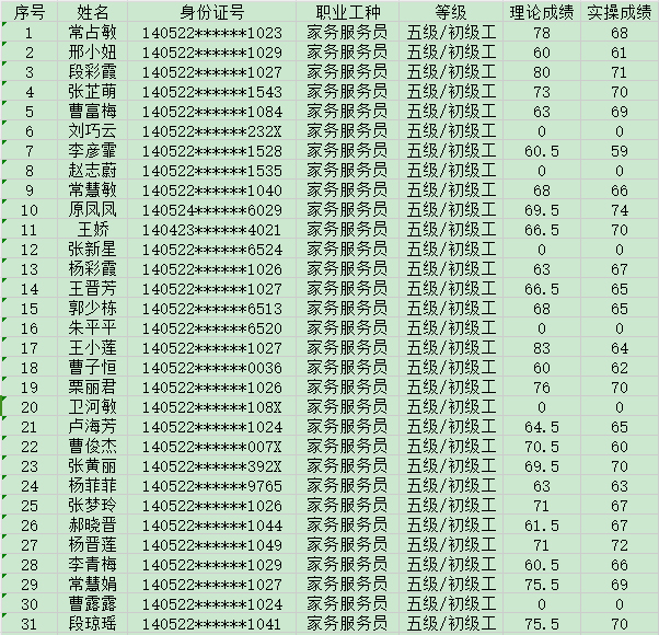 2024年8月31日第33批家政服務員初級認定人員成績公示